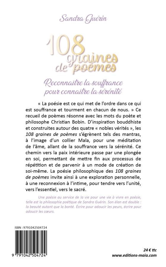 « La poésie est ce qui met de l’ordre dans ce qui est souffrance et tourment en chacun de nous. » Ce recueil de poèmes résonne avec les mots du poète et philosophe Christian Bobin. D’inspiration bouddhiste et construites autour des quatre « nobles vérités », les 108 graines de poèmes s’égrènent tels des mantras, à l’image d’un collier Mala, pour une méditation de l’âme, allant de la souffrance vers la sérénité. Ce chemin vers la paix intérieure passe par une plongée en soi, permettant de mettre fin aux processus de répétition et de parvenir à un mode de création de soi-même. La poésie philosophique des 108 graines de poèmes invite ainsi à une exploration personnelle, à une reconnexion à l’intime, pour tendre vers l’unité, vers l’essentiel, vers le sacré.