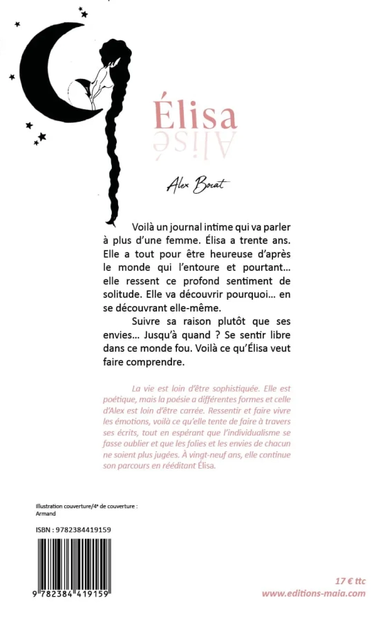 La vie est loin d’être sophistiquée. Elle est poétique, mais la poésie a différentes formes et celle d’Alex est loin d’être carrée. Ressentir et faire vivre les émotions, voilà ce qu’elle tente de faire à travers ses écrits, tout en espérant que l’individualisme se fasse oublier et que les folies et les envies de chacun ne soient plus jugées. À vingt-neuf ans, elle continue son parcours en rééditant Élisa.