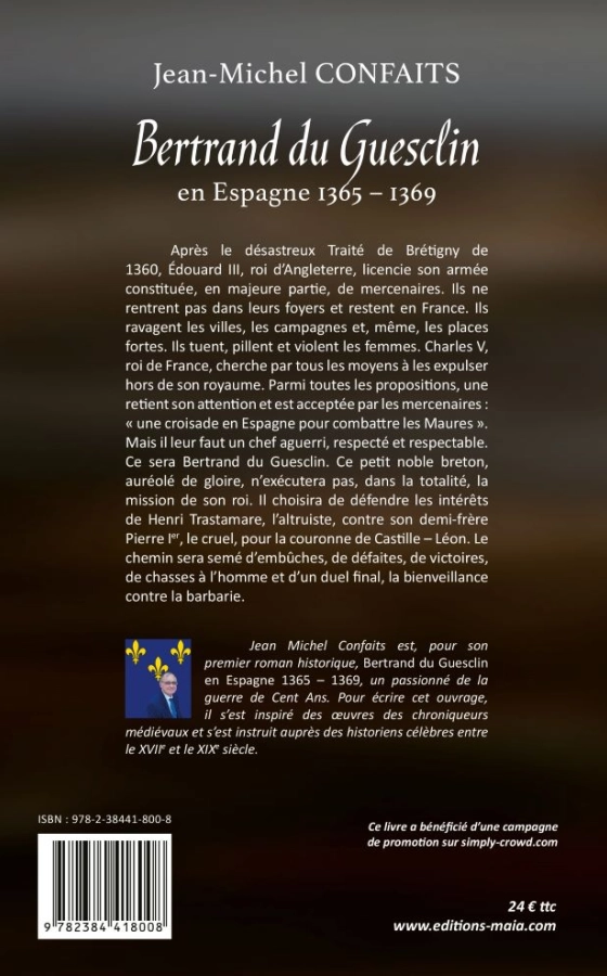 Jean Michel Confaits est, pour son premier roman historique, Bertrand du Guesclin en Espagne 1365 – 1369, un passionné de la guerre de Cent Ans. Pour écrire cet ouvrage, il s’est inspiré des œuvres des chroniqueurs médiévaux et s’est instruit auprès des historiens célèbres entre le XVIIe et le XIXe siècle.