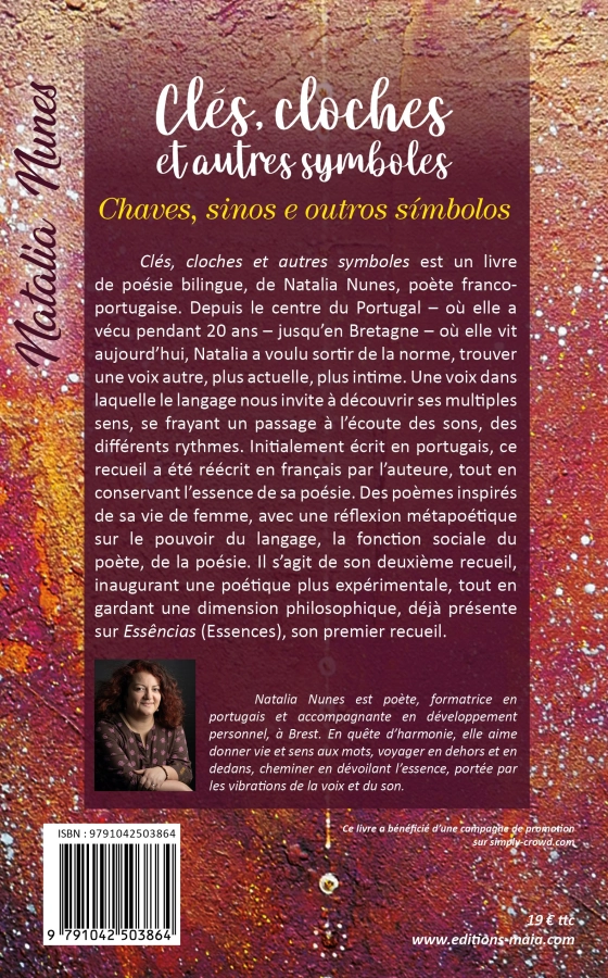 Clés, cloches et autres symboles est un livre de poésie bilingue, de Natalia Nunes, poète franco-portugaise. Depuis le centre du Portugal – où elle a vécu pendant 20 ans – jusqu’en Bretagne – où elle vit aujourd’hui, Natalia a voulu sortir de la norme, trouver une voix autre, plus actuelle, plus intime. Une voix dans laquelle le langage nous invite à découvrir ses multiples sens, se frayant un passage à l’écoute des sons, des différents rythmes. Initialement écrit en portugais, ce recueil a été réécrit en français par l’auteure, tout en conservant l’essence de sa poésie. Des poèmes inspirés de sa vie de femme, avec une réflexion métapoétique sur le pouvoir du langage, la fonction sociale du poète, de la poésie. Il s’agit de son deuxième recueil, inaugurant une poétique plus expérimentale, tout en gardant une dimension philosophique, déjà présente sur Essências (Essences), son premier recueil.