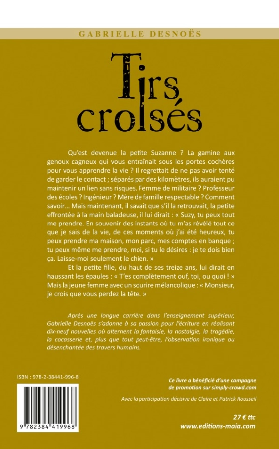Après une longue carrière dans l’enseignement supérieur, Gabrielle Desnoës s’adonne à sa passion pour l’écriture en réalisant dix-neuf nouvelles où alternent la fantaisie, la nostalgie, la tragédie, la cocasserie et, plus que tout peut-être, l’observation ironique ou désenchantée des travers humains.