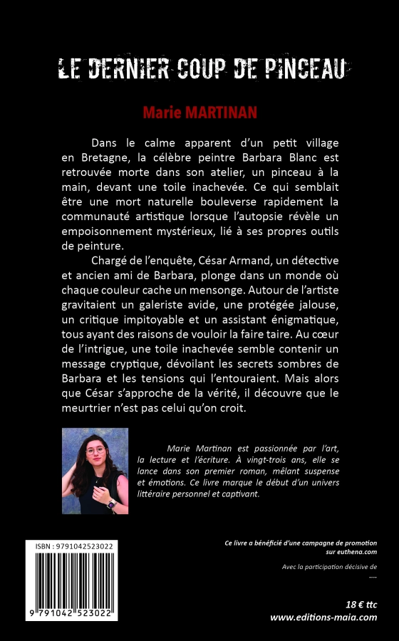 Le Dernier Coup de Pinceau est un thriller artistique où l’art devient le fil conducteur d’une enquête haletante. Au croisement du polar et de la littérature artistique, le roman met en lumière la fragilité des artistes face aux rivalités, aux manipulations et aux passions dévastatrices. Son originalité réside dans l’association entre intrigue criminelle et univers esthétique, où chaque tableau et chaque coup de pinceau prennent une dimension presque symbolique. Ce projet mérite d’être soutenu, car il propose une lecture immersive qui séduira aussi bien les amateurs de polars que les passionnés d’art.