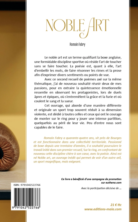 Romain Fabry a 44 ans, vit près de Bourges et est fonctionnaire dans une collectivité territoriale. Passionné de boxe depuis une trentaine d’années, il a souhaité poursuivre le travail initié dans son premier recueil « Sur le ring » déjà publié aux Éditions Maïa, en confrontant de nouveau cette discipline chère à son cœur, avec la poésie. Ainsi est né « Noble art », un ouvrage inédit qui permet de voir d’un autre œil, un sport magnifique, mais exigeant.