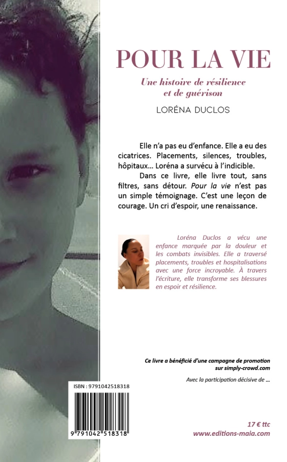 Je suis Loréna, une jeune femme brisée, mais entière. Mon livre, "Pour la vie", retrace un parcours semé d’épreuves : enfance chaotique, douleurs psychologiques, hôpital psychiatrique, solitude… mais aussi une immense envie de vivre malgré tout. Je m’inspire de ma propre survie pour offrir un témoignage bouleversant et authentique. Écrire était vital : pour me libérer, pour dénoncer, pour guérir.